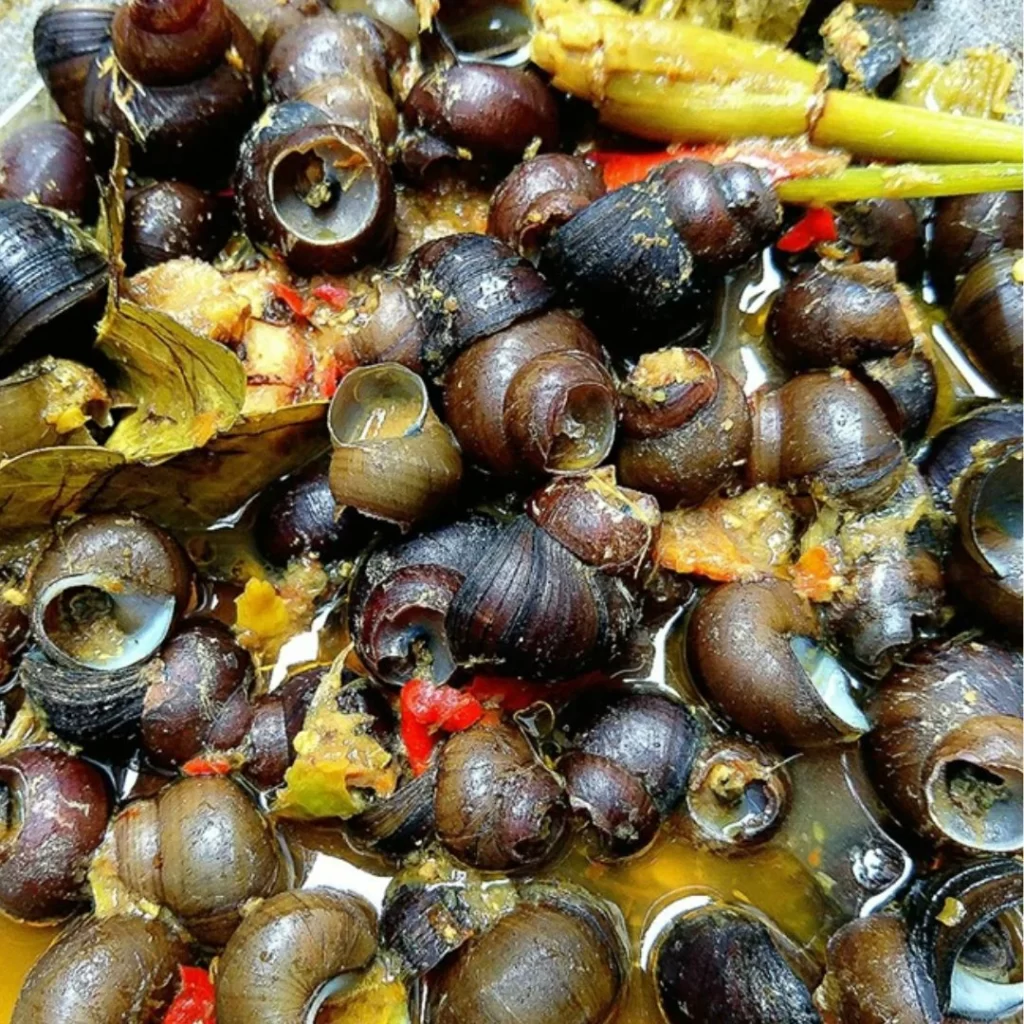 Olahan keong sawah yang lezat dan diolah dengan berbagai rempah yang menggugah selera. Cara menikmatinya yang di sedot menjadi daya tarik tersendiri.