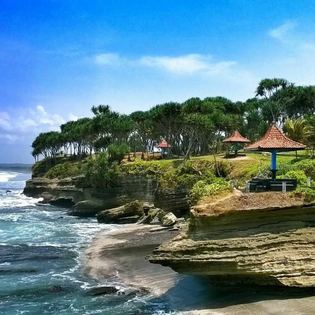 Menampilkan pemandangan Samudera Hindia dari bukit karang yang menjorok ke laut. Nama Pantai Batu Hiu berasal dari batu karang unik di tengah laut yang bentuknya mirip ikan hiu.