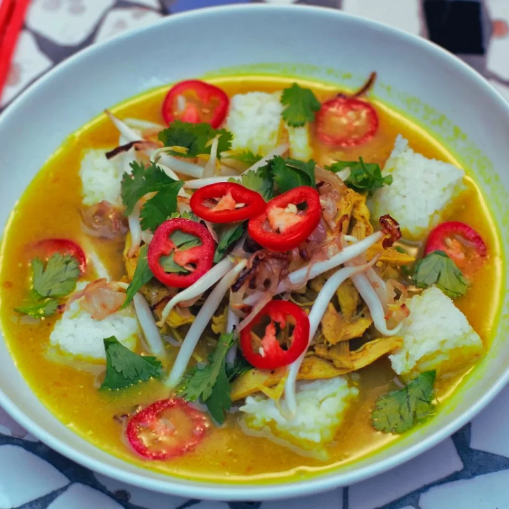 Hidangan khas yang menampilkan kombinasi taoge rebus, potongan tahu, dan lontong berukuran besar yang disebut “bongko”. Disajikan dalam kuah santan berwarna kuning, dengan bumbu-bumbu seperti bawang, cabai, kunyit, lengkuas, dan kemiri..