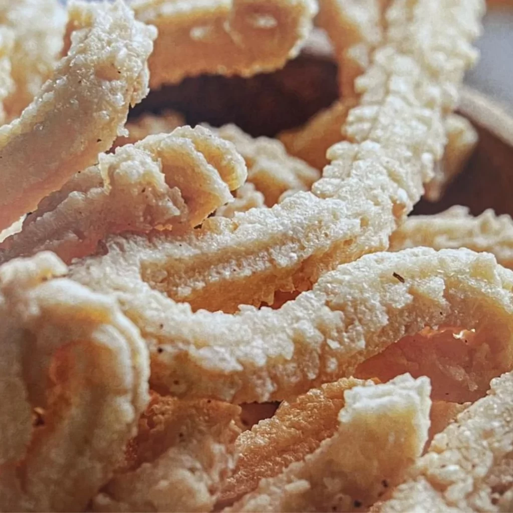 Terbuat dari adonan yang dicetak menggunakan alat khusus sehingga menghasilkan tekstur dan bentuk yang mirip dengan akar kelapa. Meski sederhana, rasa dan teksturnya bisa membuat siapa saja ketagihan.