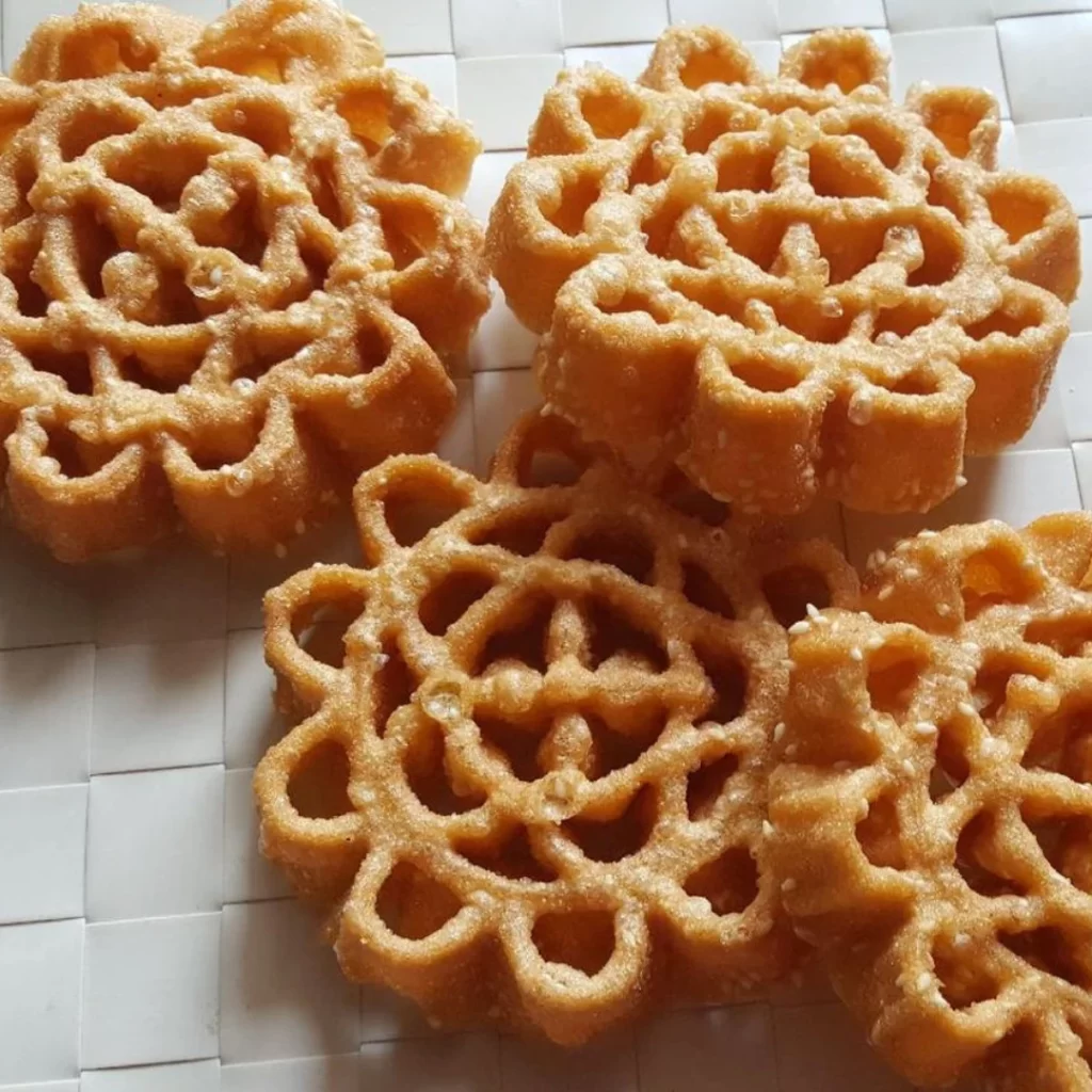 Juga dikenal sebagai Kue Roda Delman. Kue ini memiliki bentuk unik seperti bunga atau roda delman, dan terkenal dengan teksturnya yang renyah serta rasanya yang manis.
